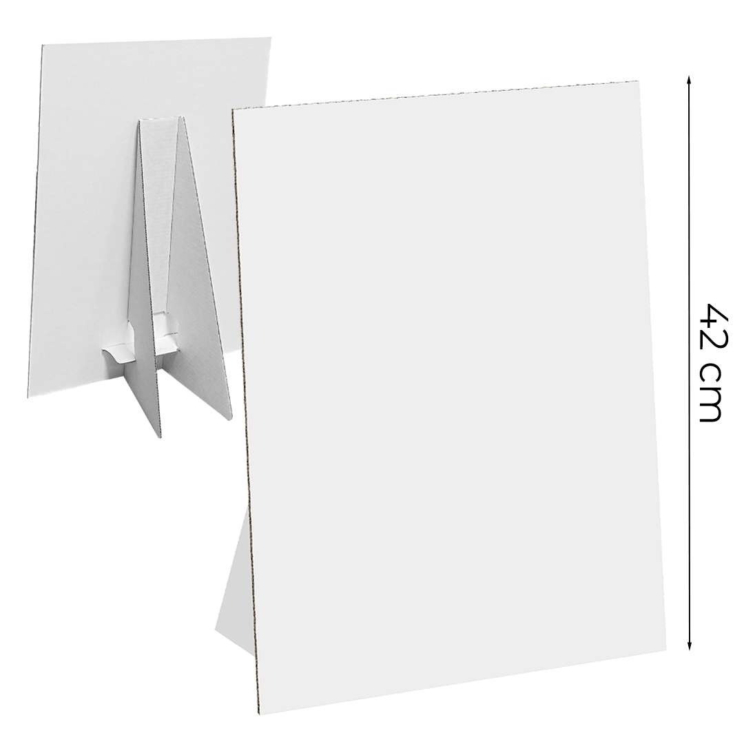 Cartello vetrina in formato 30x42 cm, personalizzabile con stampa diretta su cartone teso da 2 mm. Autoportante grazie al piedino in cartone incollato sul retro e appiattibile per un trasporto facile. Ideale per promuovere prodotti, offerte e messaggi pubblicitari in negozio o durante eventi e fiere.