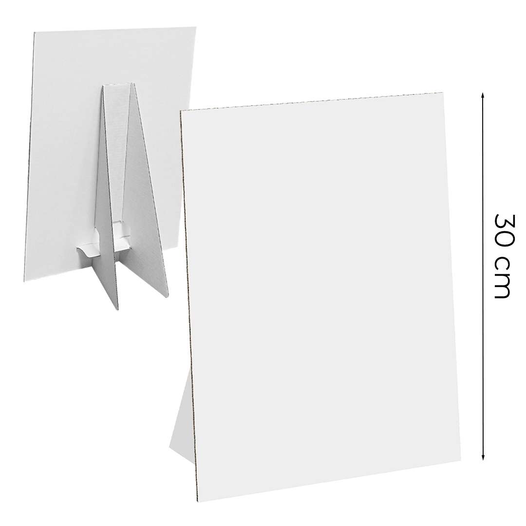 Cartello vetrina in formato 21x30 cm, personalizzabile con stampa diretta su cartone teso da 2 mm. Autoportante grazie al piedino in cartone incollato sul retro e appiattibile per un trasporto facile. Ideale per promuovere prodotti, offerte e messaggi pubblicitari in negozio o durante eventi e fiere.