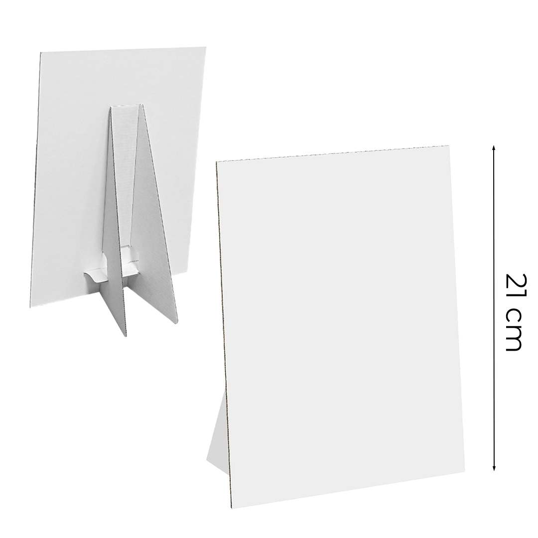 Cartello vetrina in formato 15x21 cm, personalizzabile con stampa diretta su cartone teso da 2 mm. Autoportante grazie al piedino in cartone incollato sul retro e appiattibile per un trasporto facile. Ideale per promuovere prodotti, offerte e messaggi pubblicitari in negozio o durante eventi e fiere.