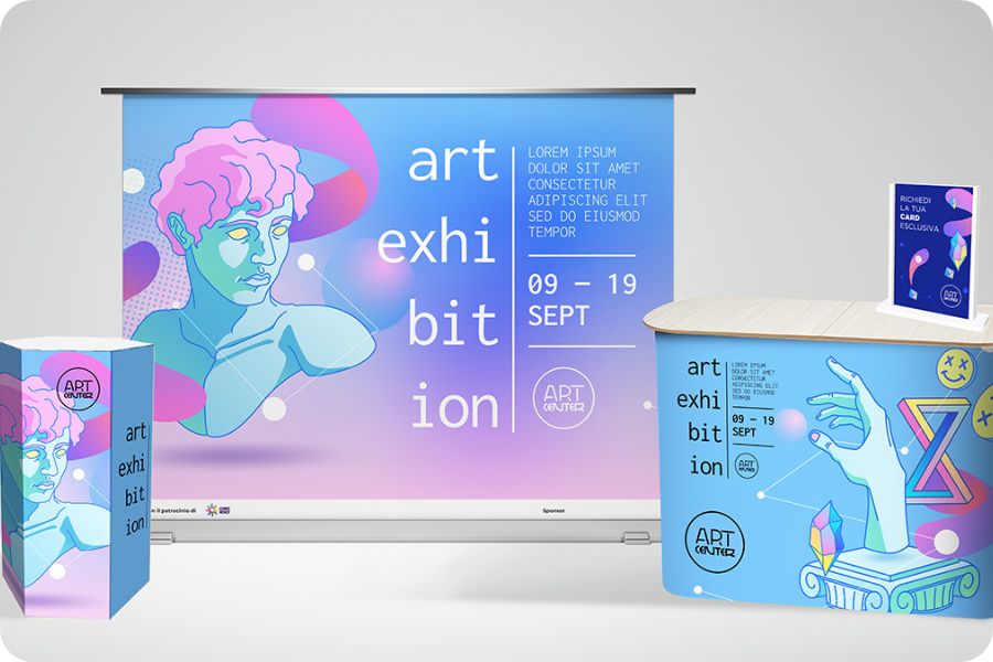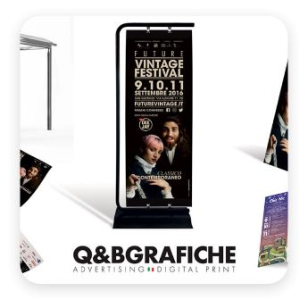 espositori personalizzati da terra e da banco, roll-up, totem, bandiere, fondali, pop-up, desk e appendimenti.