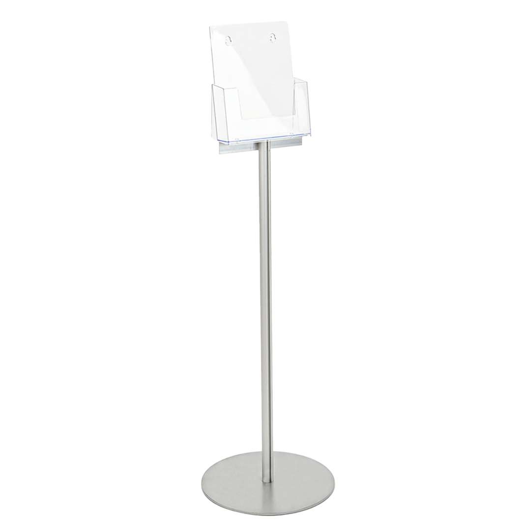 Colonna porta depliant da pavimento, dotata di base circolare in metallo verniciato a polvere color silver, con diametro di 35 cm. Il montante è in alluminio anodizzato color silver, con diametro di 3 cm. Completa il tutto una tasca porta depliant in styrene trasparente, adatta a depliant in formato A4.