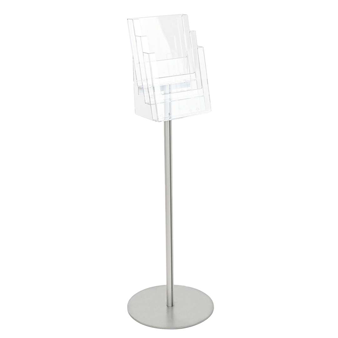Colonna porta depliant da pavimento, dotata di base circolare in metallo verniciato a polvere color silver, con diametro di 35 cm. Il montante è in alluminio anodizzato color silver, con diametro di 3 cm. Completa il tutto una tasca porta depliant a 3 scomparti in styrene trasparente, adatta a depliant in formato A4.