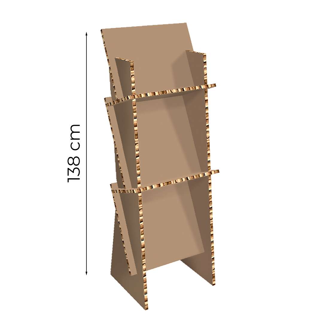Espositore da terra con 2 ripiani in cartone alveolare avana da 16 mm, completamente personalizzabile con la tua grafica tramite stampa. Ideale per allestire ambienti interni, questo espositore è realizzato con un materiale resistente e presenta ripiani inclinati, offrendo una soluzione perfetta per contenere prodotti di medie dimensioni, anche pesanti, come libri, cataloghi e brochure. La personalizzazione consente di adattarlo al tuo brand, creando un'esposizione unica e visibile.