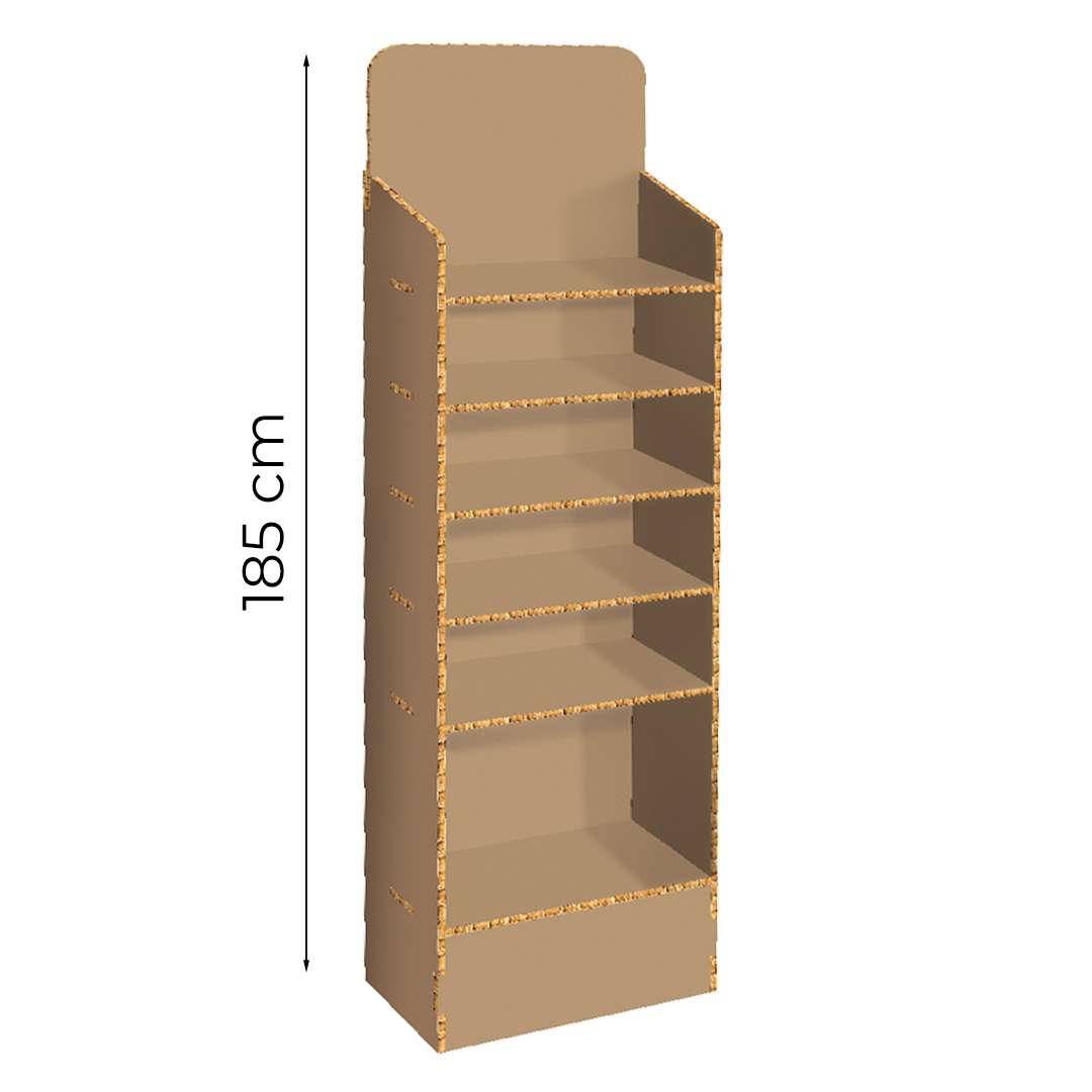 Espositore ecosostenibile da terra con 6 ripiani, realizzato in cartone alveolare avana da 10 mm e completamente personalizzabile con la tua grafica tramite stampa. Ideale per allestire ambienti interni, questo espositore è la soluzione perfetta per contenere prodotti di piccole e medie dimensioni, offrendo una struttura robusta e rispettosa dell’ambiente. La possibilità di personalizzazione ti consente di adattarlo al meglio alle tue esigenze di branding, creando un'esposizione unica e visibile.