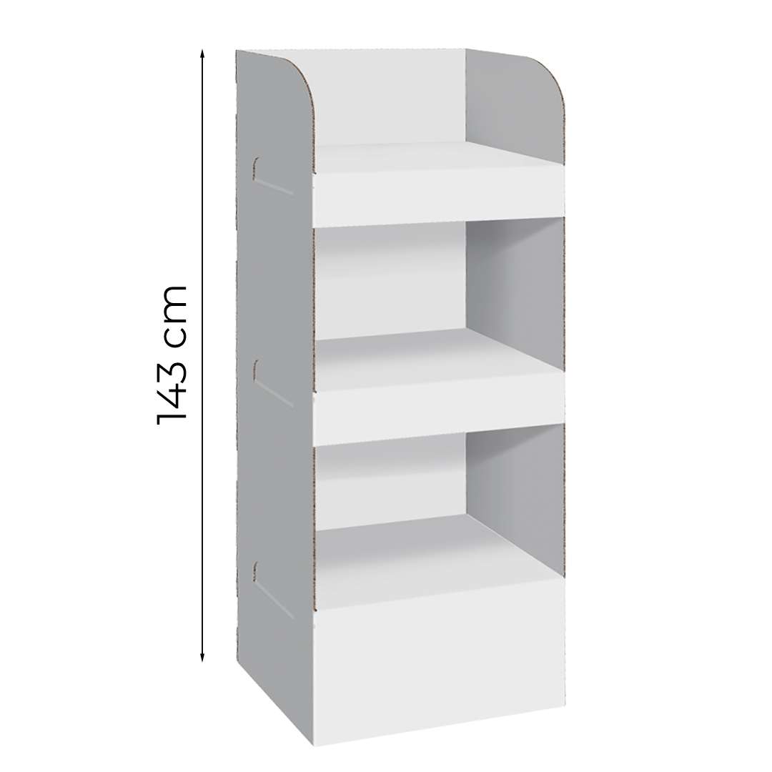 Espositore da terra con 3 ripiani in cartone doppia onda da 3 mm, completamente personalizzabile con la tua grafica tramite stampa. Ideale per allestire ambienti interni, questo espositore è progettato per contenere prodotti di grandi dimensioni, offrendo una soluzione robusta e visibile per un'esposizione ordinata e professionale.
