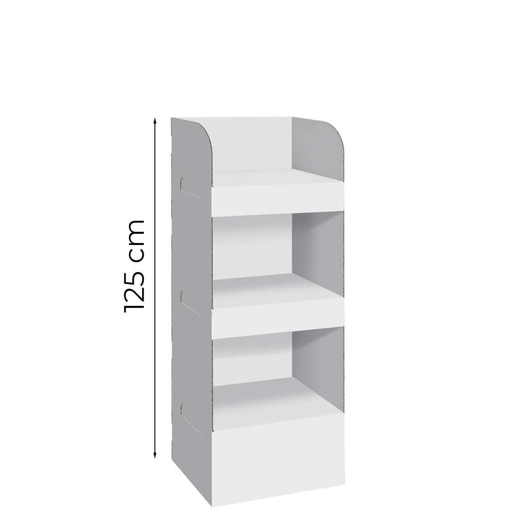 Espositore da terra con 3 ripiani in cartone doppia onda da 3 mm, completamente personalizzabile con la tua grafica tramite stampa. Ideale per allestire ambienti interni, questo espositore è progettato per contenere prodotti di grandi dimensioni, offrendo una soluzione robusta e visibile per un'esposizione ordinata e professionale.