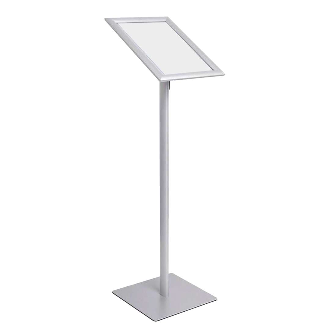 Pannello informativo da terra con supporto a leggio. Cornice a scatto in alluminio finitura silver, con angoli vivi e sistema che consente una facile sostituzione della grafica. Formato A3, orientabile sia in verticale sia in orizzontale. Montante in alluminio anodizzato silver e base quadrata in metallo verniciato a polvere color silver. Foglio di protezione in PVC trasparente in dotazione.