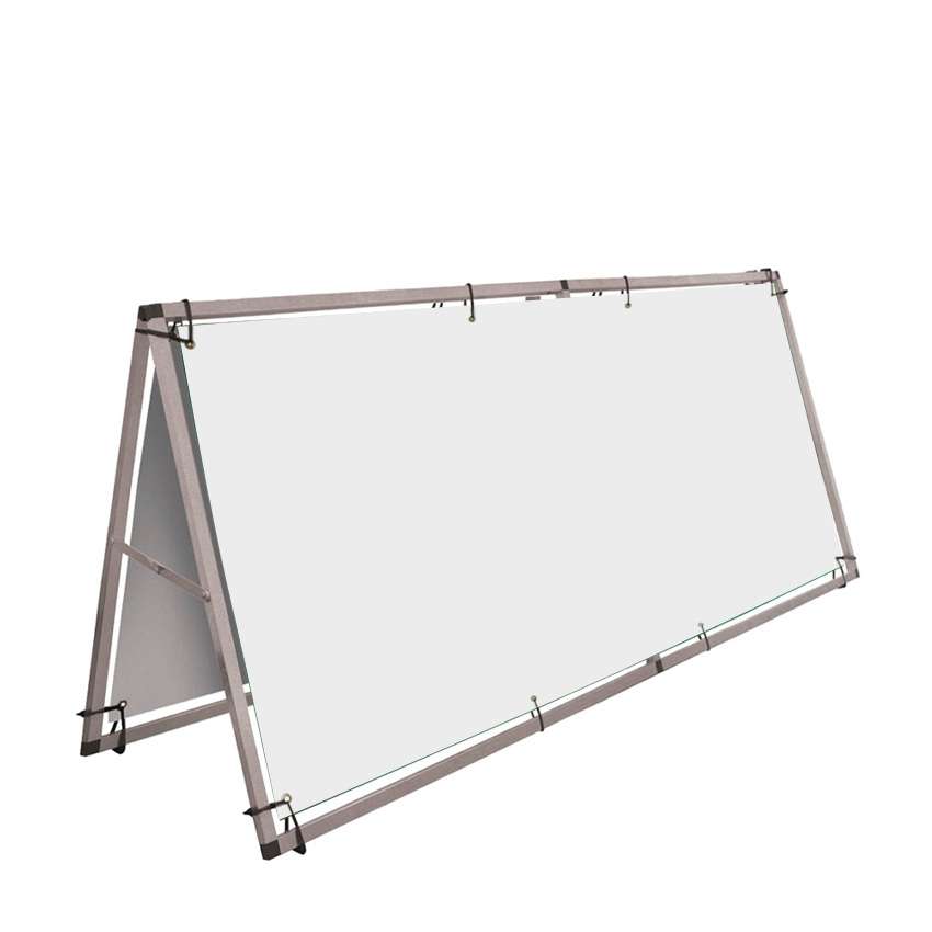 La struttura porta banner a forma di A è autoportante e bifacciale e realizzata in alluminio leggero, adatta all’uso esterno. Completo di stampa personalizzabile su banner in PVC da 610 g, che si aggancia alla struttura grazie a un sistema di occhielli ed elastici tenditelo che assicura una corretta tensione. I tubi quadrati da 25 mm consentono un montaggio rapido ad incastro senza utensili. È completa di picchetti per il fissaggio al terreno e borsa per il trasporto. Resiste a venti fino a 18–24 mph (grado 5 della scala di Beaufort).